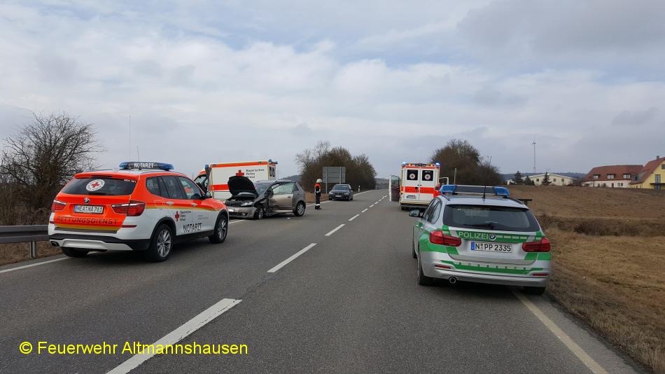 Einsatzbericht: Auf der B8 bei Altmannshausen ereignete sich ein Verkehrsunfall mit 2 Fahrzeugen. Beim Eintreffen befand sich noch eine Person in einem der beteiligen PKW's. Die FF Altmannshausen kümmerte sich um die Verkehrsabsicherung und unterstützte den Rettungsdienst.