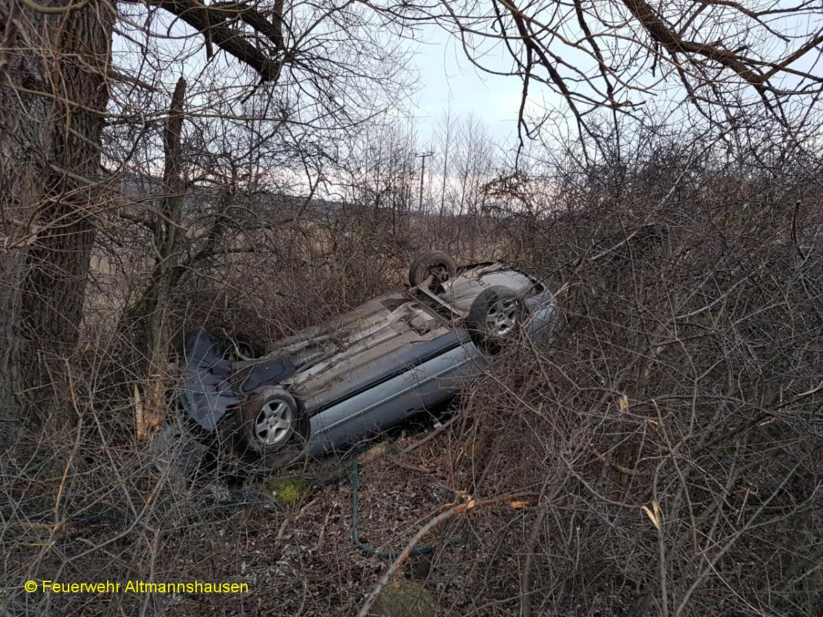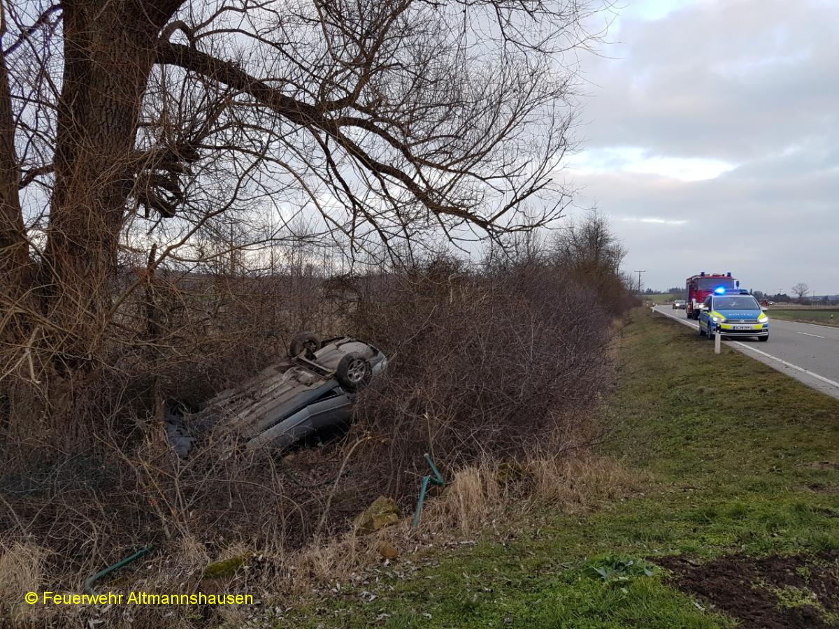 Auf der B8 zwischen Altmannshausen und Markt Bibart verlor ein PKW die Kontrolle und landete auf dem Dach in einem Gebüsch neben der Fahrbahn. Der Fahrer konnte sich selbstständig befreien. Zusammen mit der Feuerwehr Markt Bibart übernahmen wir die Verkehrsabsicherung auf der Bundesstraße. |