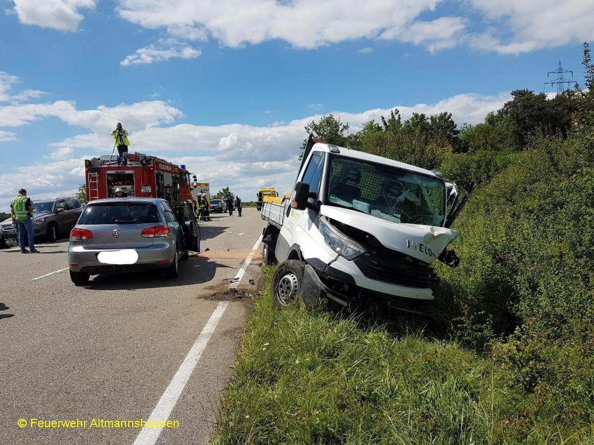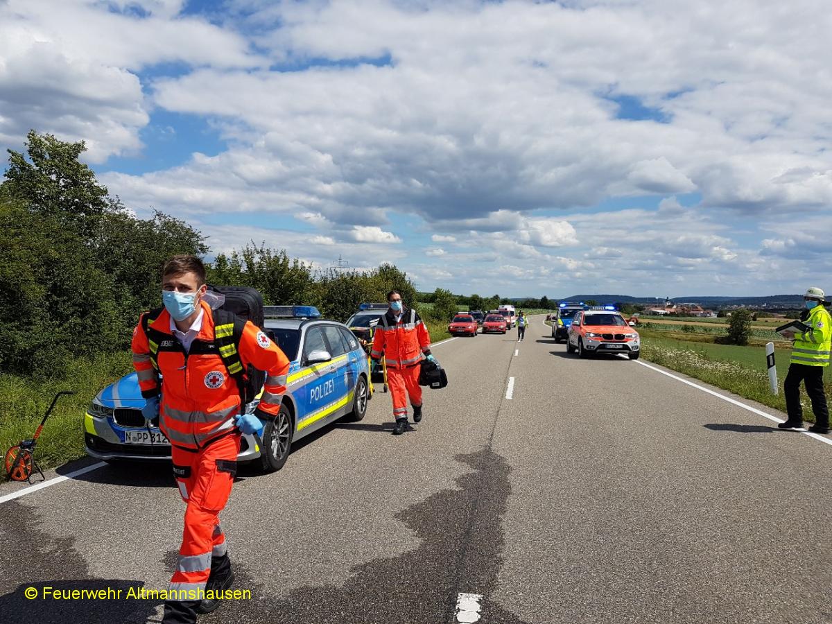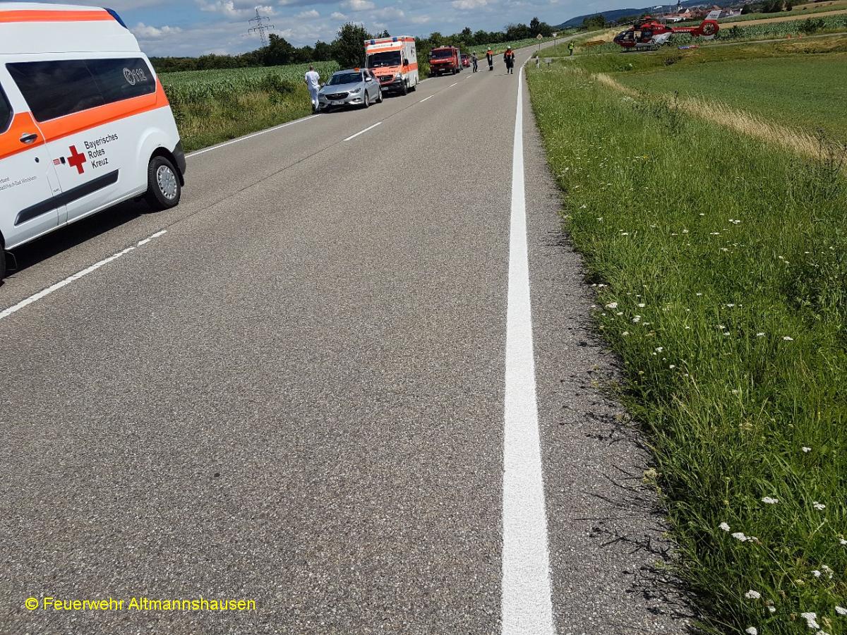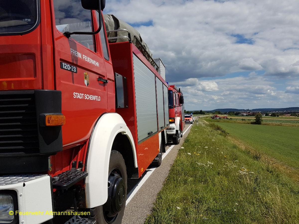 Einsatzbericht: Auf der B8 zwischen Altmannshausen und Enzlar ereignete sich ein schwerer Verkehrsunfall mit insgesamt 3 Fahrzeugen. Eine Fahrerin wurde in ihrem Fahrzeug eingeklemmt und musste mittels hydraulischen Rettungssatz befreit werden. Insgesamt wurden 5 Personen verletzt. Während der Rettungsmaßnahmen wurde die B8 komplett gesperrt. Die Zusammenarbeit der eingesetzten Wehren aus Altmannshausen, Markt Bibart, Ziegenbach und Scheinfeld sowie Polizei und Rettungsdienst funktionierte sehr gut.