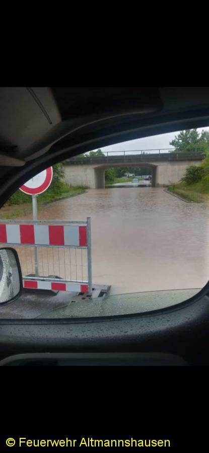 Einsatzbericht: Während wir mit unserem Fahrzeug beim Hochwassereinsatz in Sugenheim gebunden waren, erfolgte die nächste Alarmierung der FF Altmannshausen. 1 PKW hat sich in der überfluteten Bahnunterführung festgefahren. Der Fahrer musste von der Feuerwehr gerettet werden.