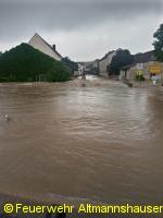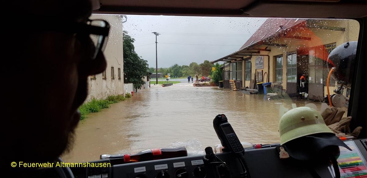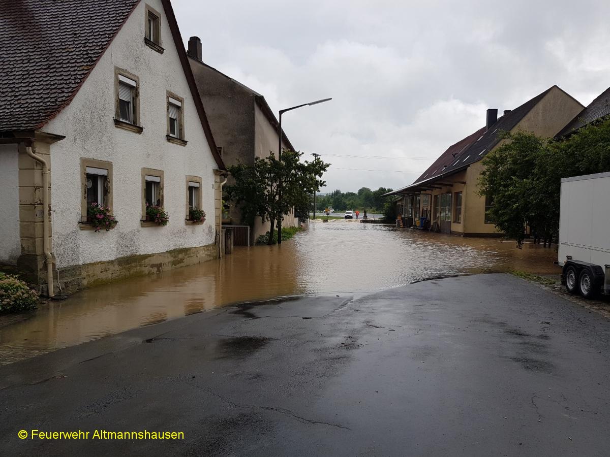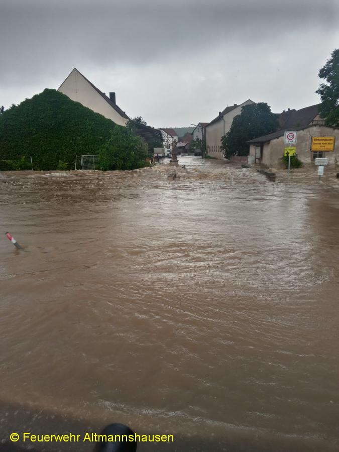 Einsatzbericht: Durch starke Regenfälle verwandelte sich der Bach zu einem reißenden Strom. Die Brücke der Haupt Ortszufahrt wurde dabei überschwemmt und schwer beschädigt. Die Brücke ist seitdem gesperrt. Die Überschwemmung in diesem kritischen Bereich war der Auslöser für die nachfolgenden Einsatzstellen. Außerdem wurde ein Telefon und Internet Knotenpunkt der Telekom überflutet, so das weder Telefon noch Internet funktionierte. Aus diesem Grund war das Gerätehaus permanent besetzt um als Anlaufstelle für Notfälle zu dienen. In Summe waren 32 Kameradinnen und Kameraden von uns im Dauereinsatz an verschiedenen Einsatzstellen. Ein Großer Dank gilt der Feuerwehr Dornheim und Iphofen die uns schnell und unbürokratisch mit Material wie Tauch- und Schmutzwasserpumpen, Nasssauger und Sandsäcken ausgeholfen haben.