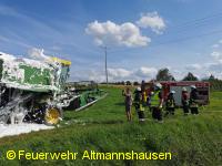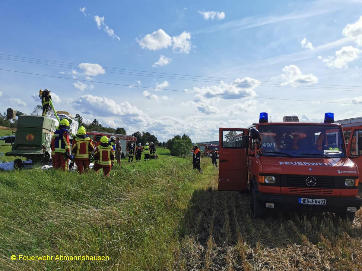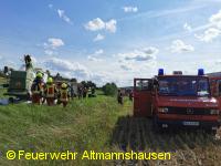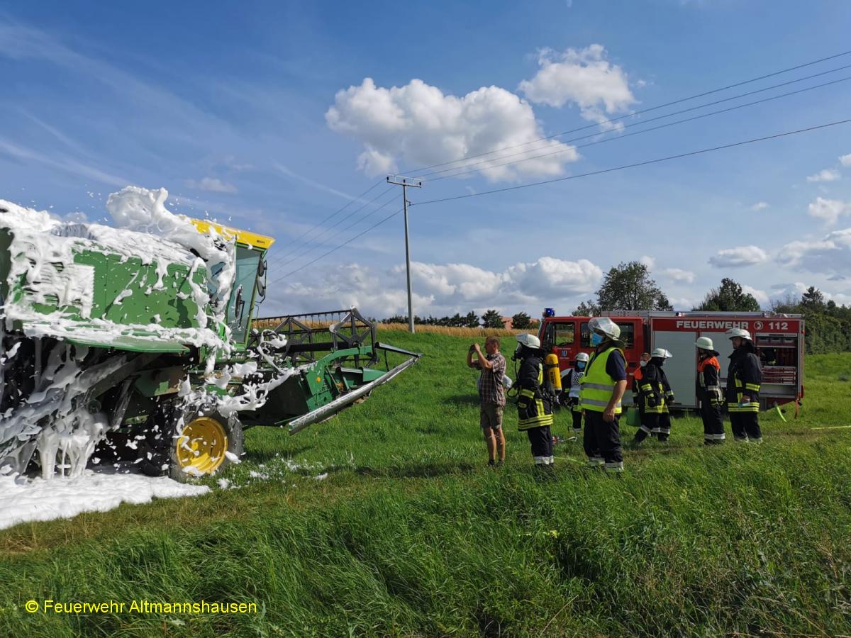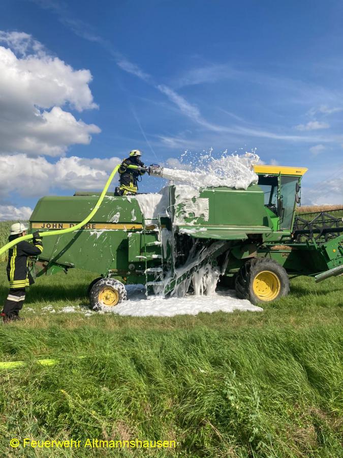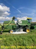 Einsatzbericht: Zweiter Einsatz innerhalb weniger Stunden. Diesmal brannte ein Mähdrescher bei Altenspeckfeld. Mittels eines Feuerlöschers und unseres Schnellangriffes konnte eine Brandausbreitung verhindert und der Brand weitgehend gelöscht werden. Um den Motorraum komplett zu löschen, wurde dieser mit Schaum durch einen PA Trupp der Feuerwehr Markt Bibart geflutet und regelmäßig mit der Wärmebildkamera kontrolliert.